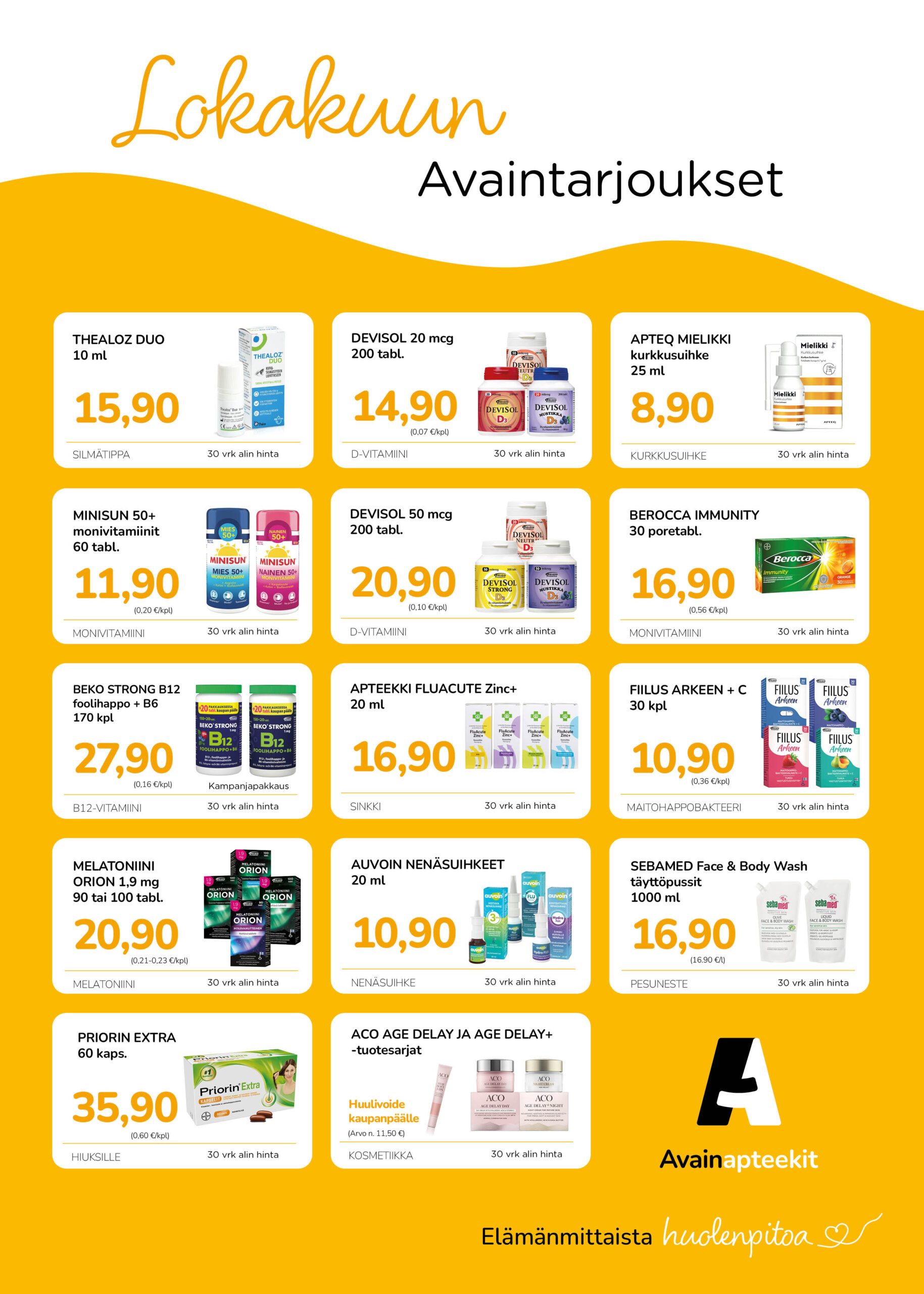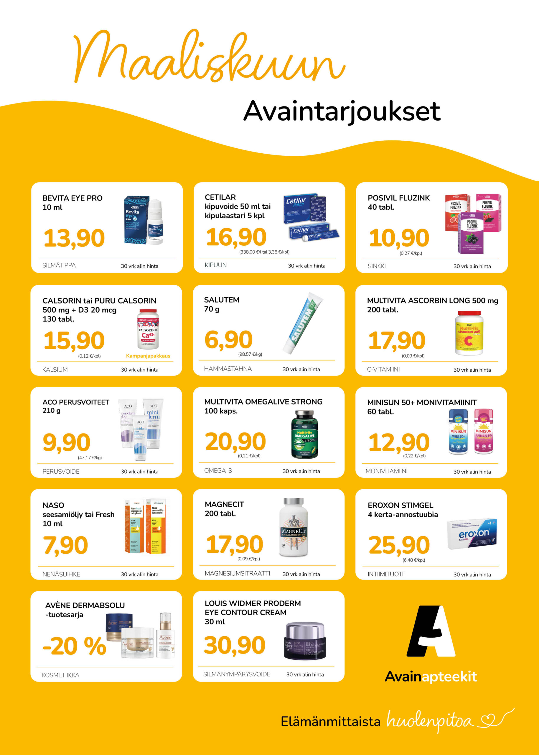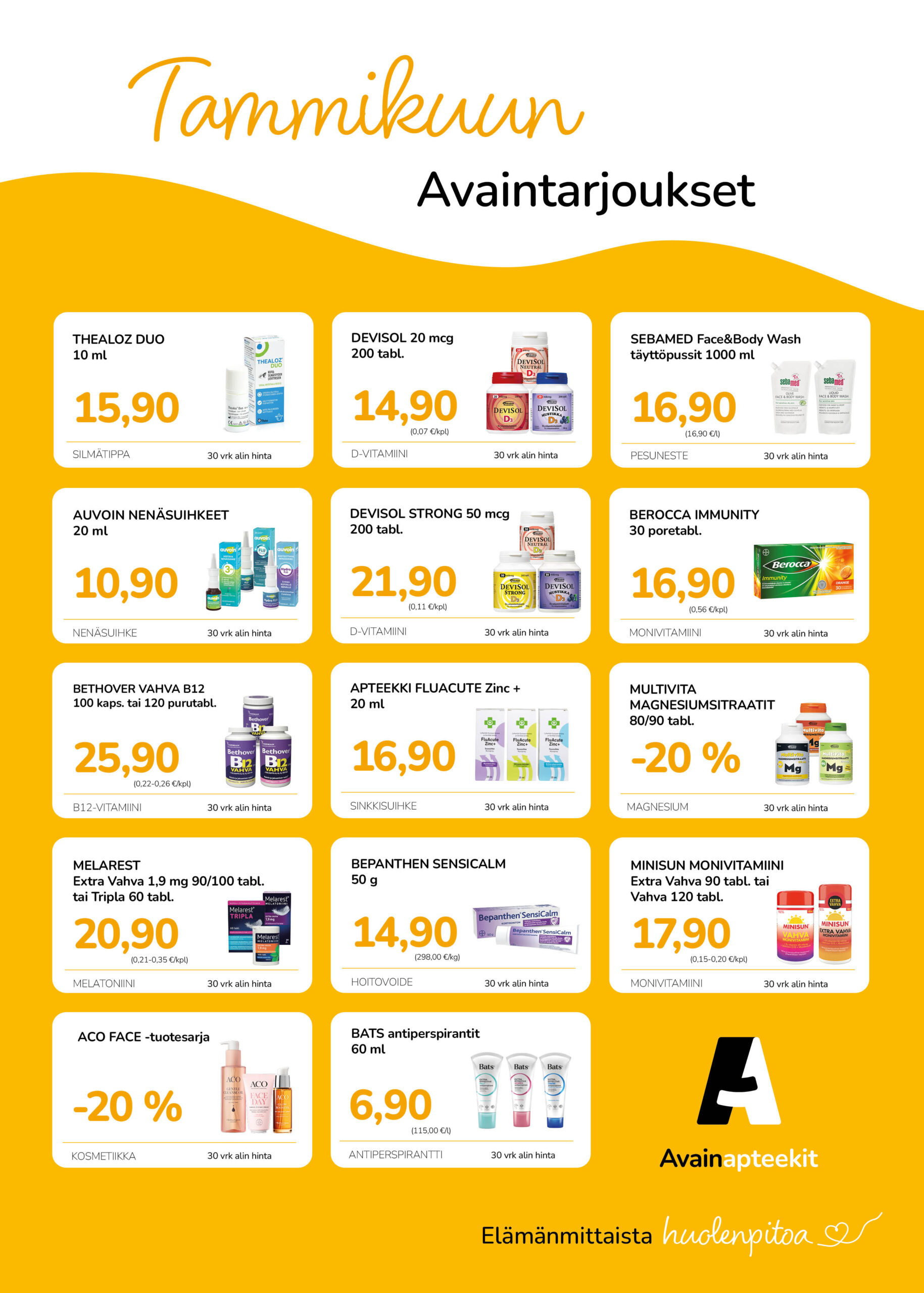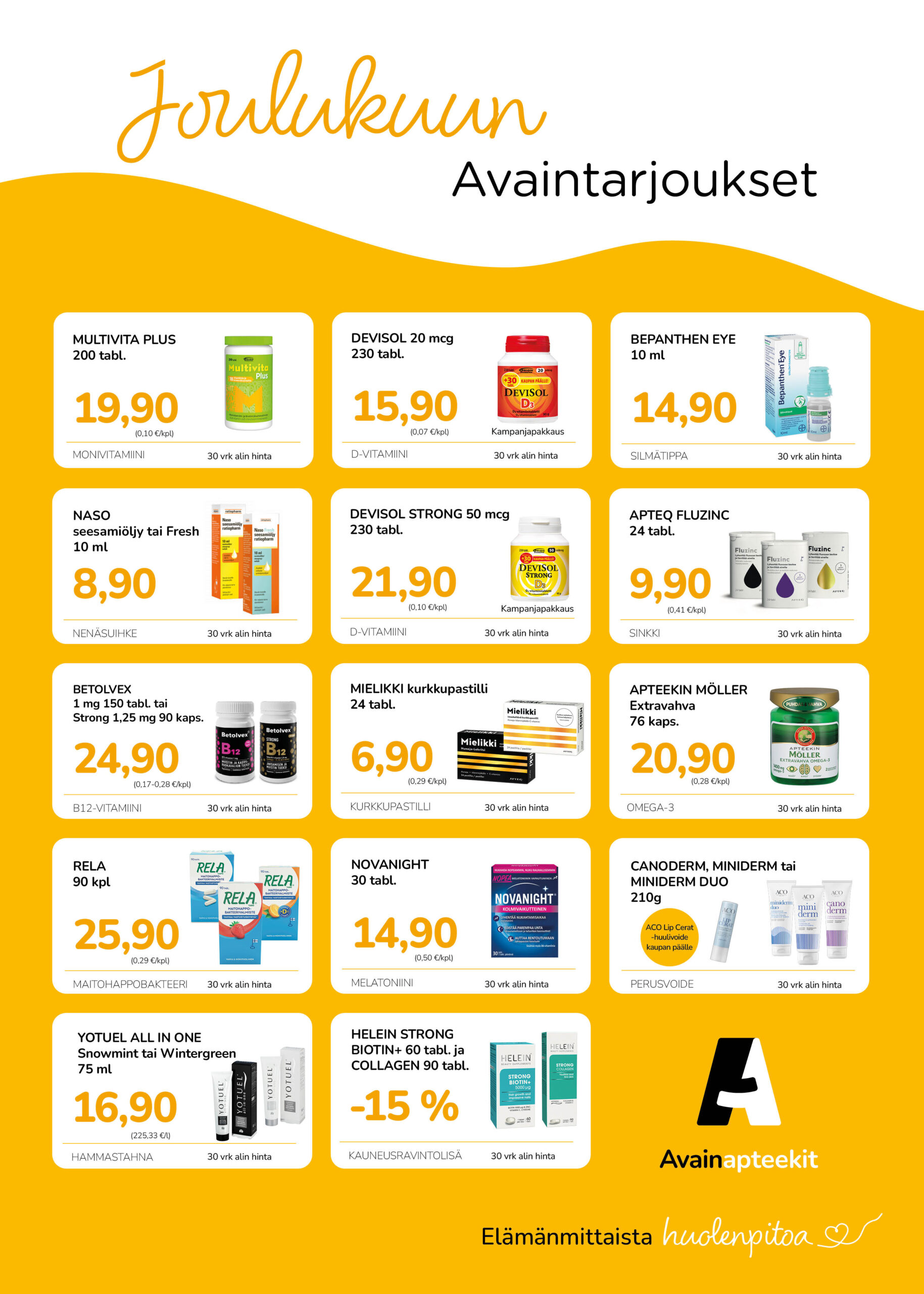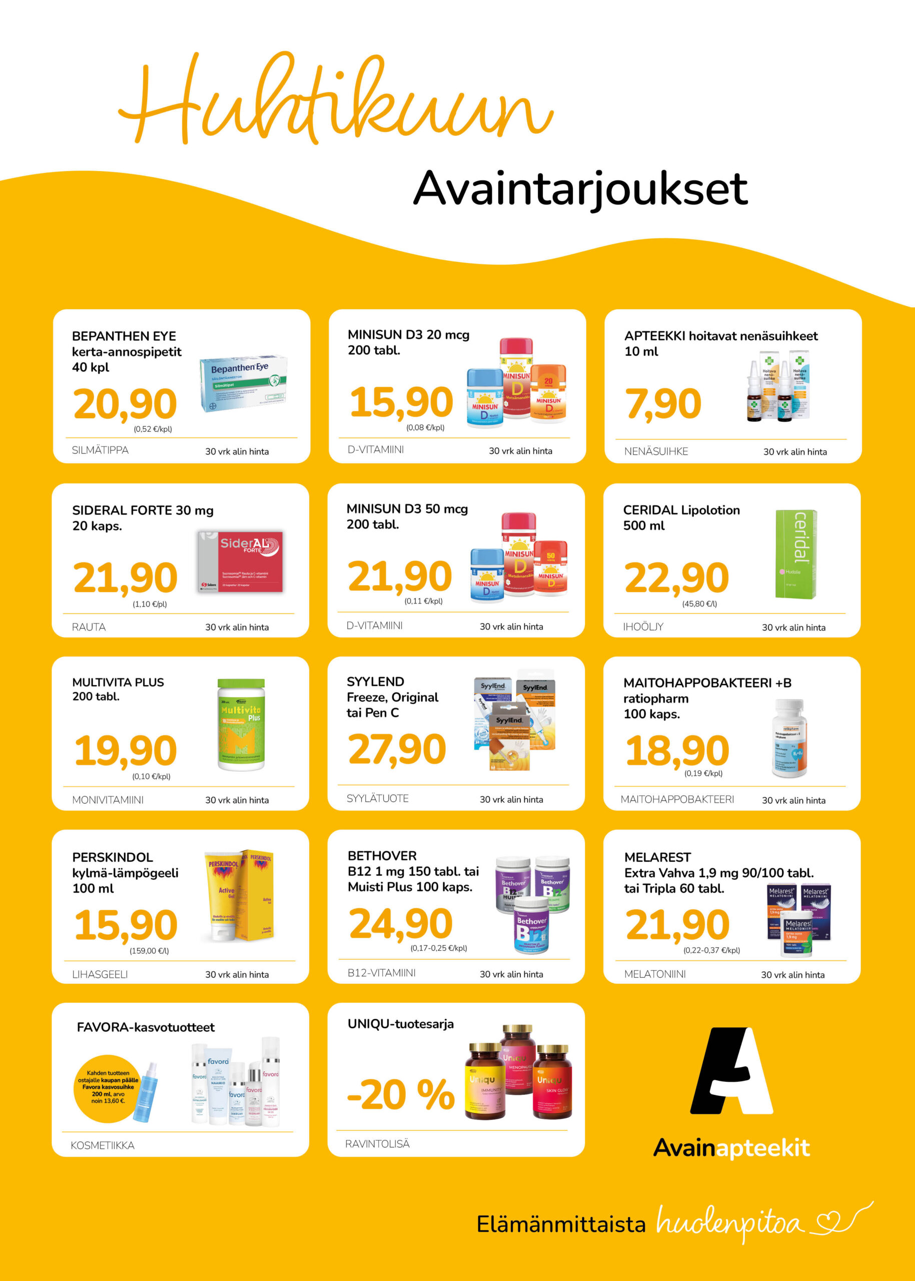 Kuulumme Avainapteekki -ketjuun. Voit liittyä Avainasiakkaaksi paikan päällä täyttämällä Avainasiakas-lomakkeen. Liittymällä saat kuukausittain vaihtuvien tarjousten lisäksi jopa 5% keskittämisalennuksen.
